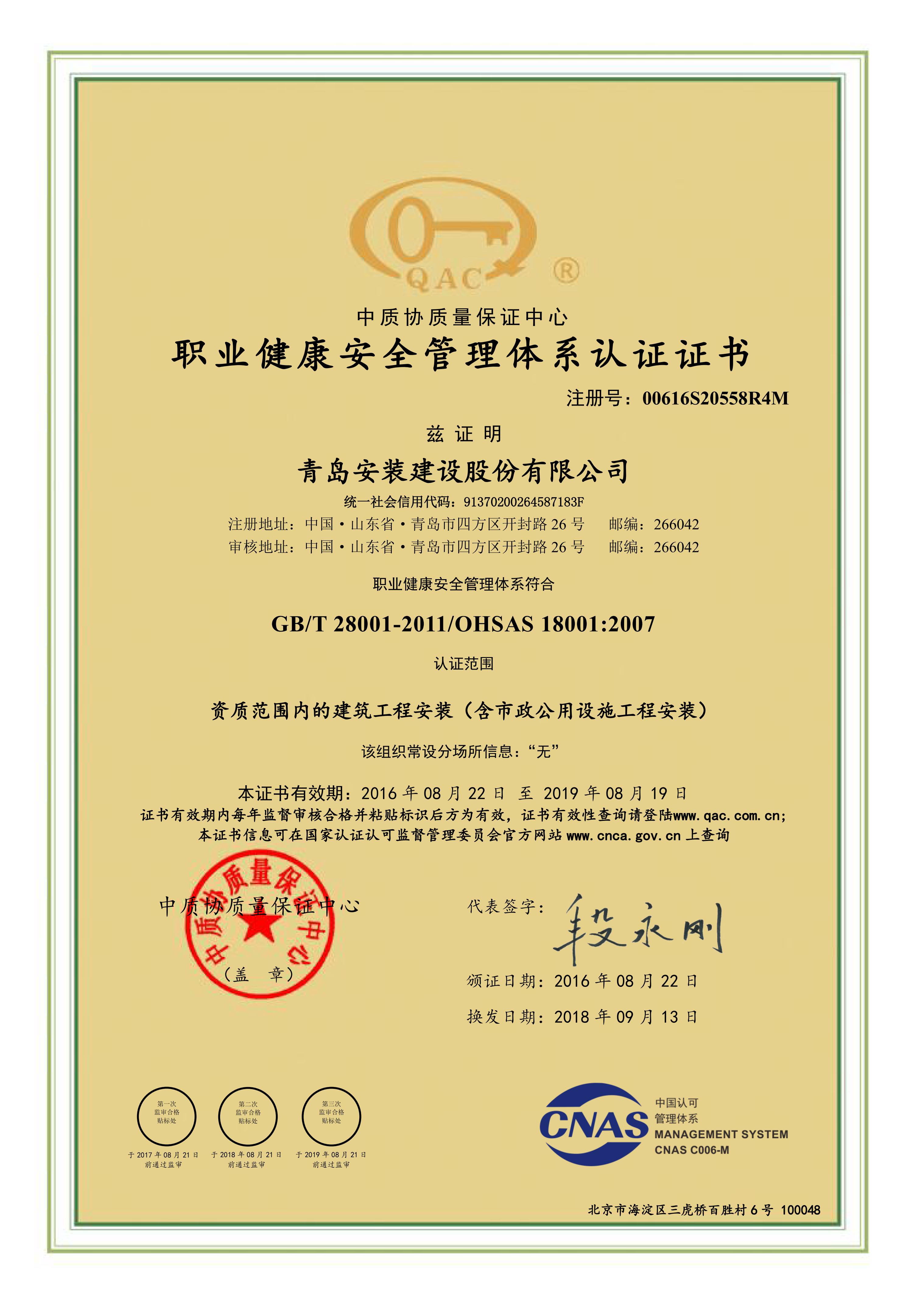 職業健康安全管理體系認證證書